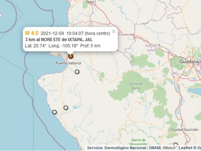 Three earthquakes of medium magnitude shook the region of Puerto Vallarta early this morning and early this morning, with no material damage reported. According to the National Seismological Service, the first earthquake of this day was registered at 01:30 a.m. with an intensity of 3.1 degrees and was located 76 kilometers southwest of Puerto Vallarta, at a depth of 23 kilometers. The second quake was reported at 04:52 a.m. with an intensity of 3.2 degrees and was located 18 kilometers southeast of Puerto Vallarta, at a depth of 6 kilometers. The third earthquake was reported at 10:04 a.m. with an intensity of 4.0 degrees and was located only 3 kilometers northeast of the Ixtapa delegation, in Puerto Vallarta, at a depth of 5 kilometers.
