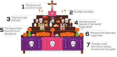 Cempasúchil flowers, sugar skulls, white candles, cut-out paper, moving photos, pan de muerto (bread of the dead), treasured photos, seeds and fruits, the tacos al pastor that loved one used to like so much and the tequila that couldn’t be missing for pairing with that tortilla, trompo and pineapple feast.